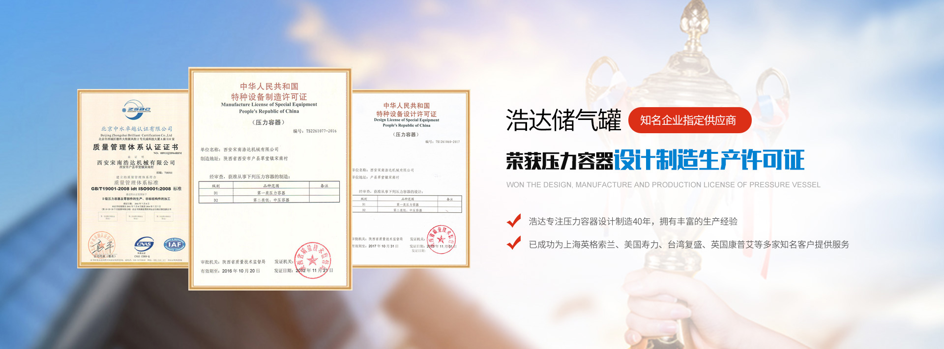 現(xiàn)有壓力容器/不銹鋼儲(chǔ)氣罐設(shè)計(jì)、制造、C級(jí)鍋爐生產(chǎn)許可證,是部級(jí)先進(jìn)企業(yè),省級(jí)安全生產(chǎn)單位,市級(jí)標(biāo)準(zhǔn)化先進(jìn)企業(yè),市級(jí)重合同、守信譽(yù)單位,二級(jí)計(jì)量企業(yè)。